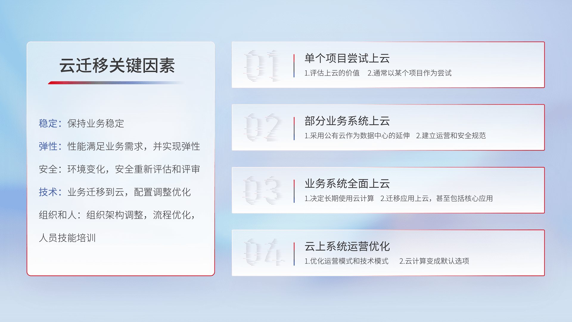 结合实际业务,,,从规划设计、、云平台选型、、云原生改造、、数据迁移、、、集成交付,,迁移全过程为客户识别最佳上云路径,,,做好风险识别管理,,,设计网络架构、、、、身份权限、、安全审计合规、、操作审计、、、日志审计、、监控告警策略、、多站点容灾设计等,,,对云上基础设施进行整体规划,,,,提升IT治理水平,,以满足弹性、、高可用、、、、高性能的需求。。。。